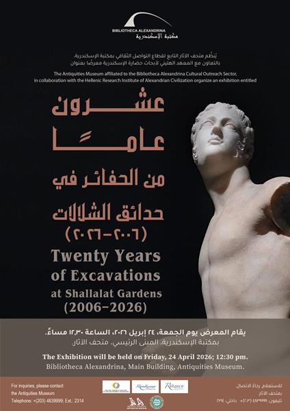 ينظم متحف الآثار التابع لقطاع التواصل الثقافي بمكتبة الإسكندرية، بالتعاون مع المعهد الهيلينى لأبحاث حضارة الاسكندرية، معرضًا بعنوان «عشرون عامًا من الحفائر في حدائق الشلالات (2006-2026)». يُقام المعرض يوم الجمعة24 إبريل 2026، الساعة 12.30 ظهرًا، بمكتبة الإسكندرية، المبنى الرئيسي، متحف الآثار.